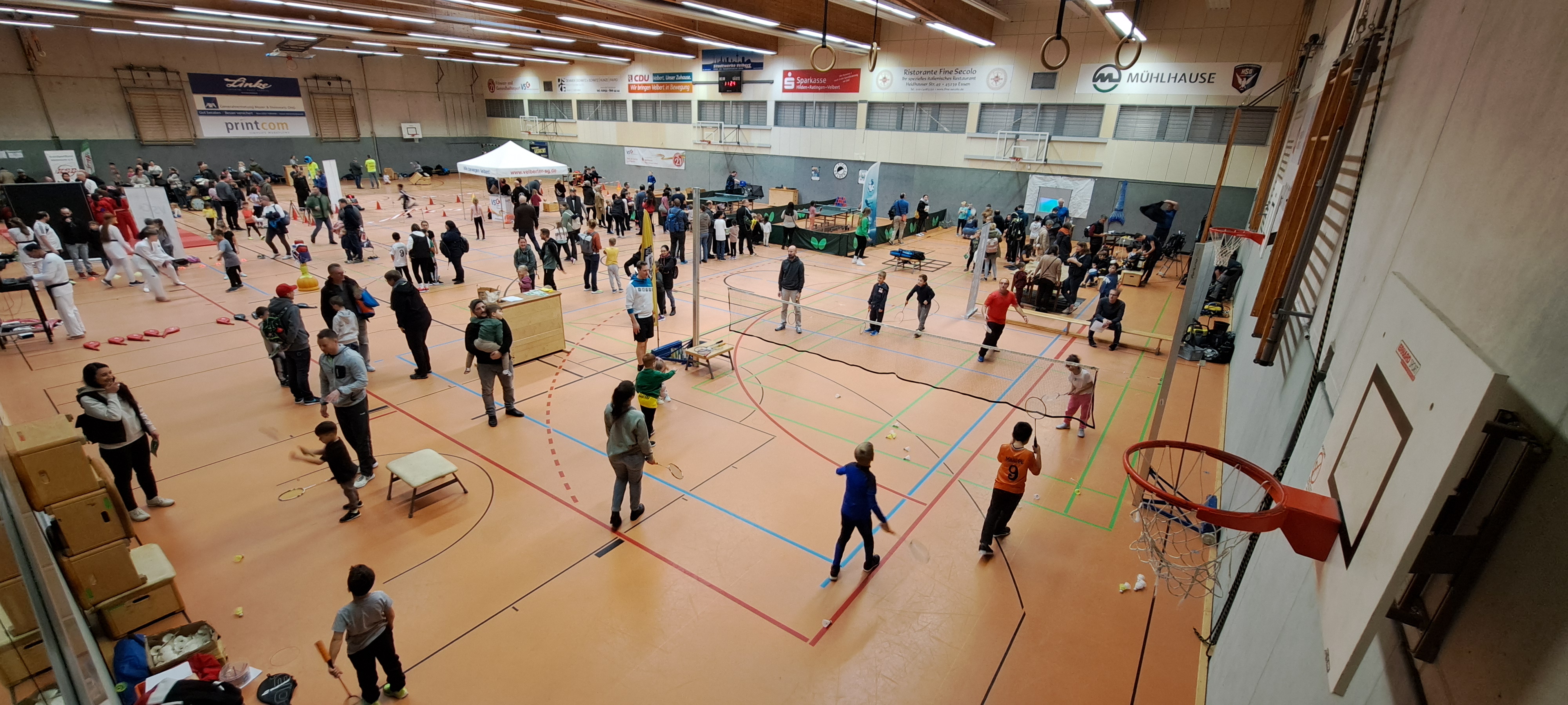 Spieler:innen der Badminton- Abteilung haben in der Turnhalle zwei Netze aufgebaut. Dort haben Kinder und Eltern den Sport ausprobiert. Unser Jungendtrainer Nils Hartmann hat ein Geschicklichkeitsspiel vorbereitet. Viele Kindern konnten so ihre Treffersicherheit und ihre Geschicklichkeit mit einem Badminton-Schläger unter Beweis stellen.